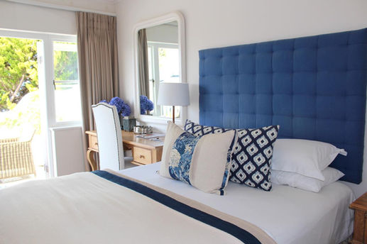 MAIN BEDROOM (First floor): This double room has a queen sized bed and is decorated in white percale linen and blue beach-style fabrics. The bathroom is ensuite and is equipped with a bath and shower. The room opens out onto the first floor terrace, with comfortable outdoor furnishings. There is a TV with DSTV and access to a WIFI connection. There are lagoon and ocean views from the room and terrace.